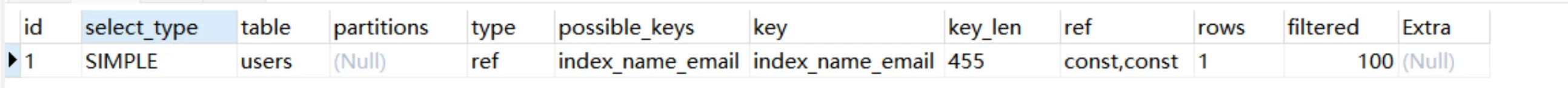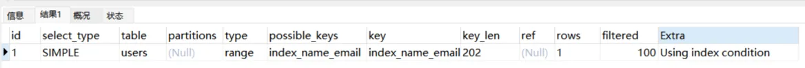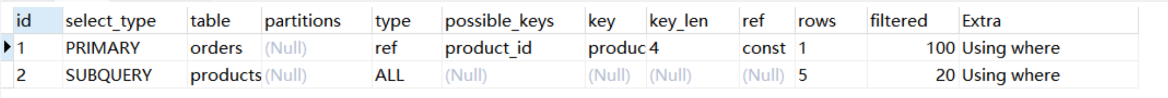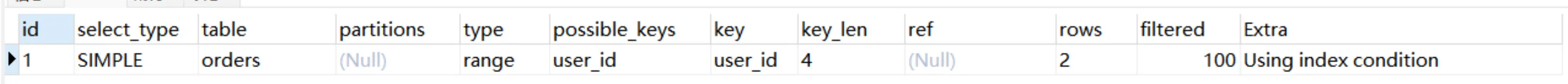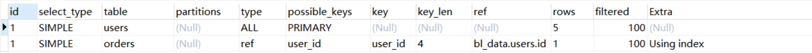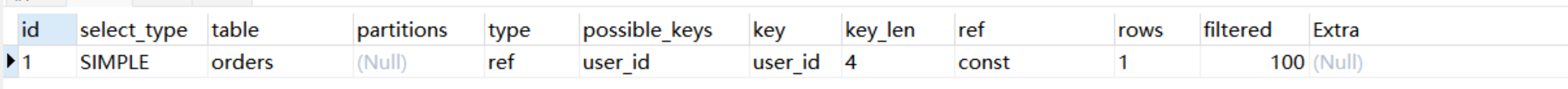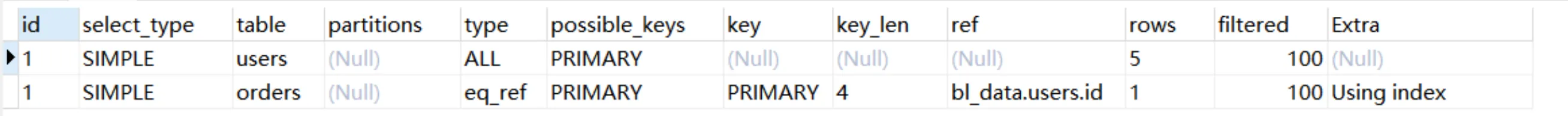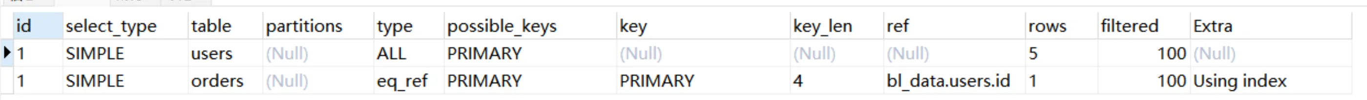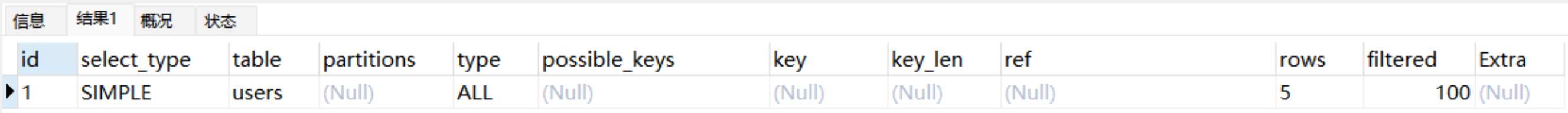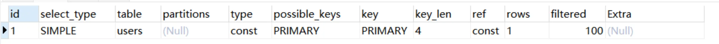 Explain Partitions select * from users;MySQL5.7版本引入了这两个特性,直接使用Explain关键字可以将partitions列、filtered列、extra列直接查询出来。