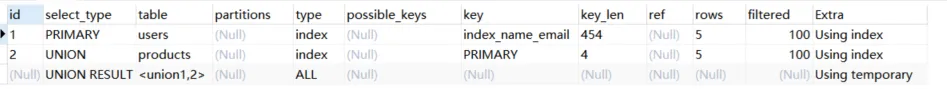 2.6.union:分union与union all两种,若第二个select出现在union之后,则被标记为union;如果union被from子句的子查询包含,那么第一个select会被标记为derived;union会针对相同的结果集进行去重,union all不会进行去重处理。