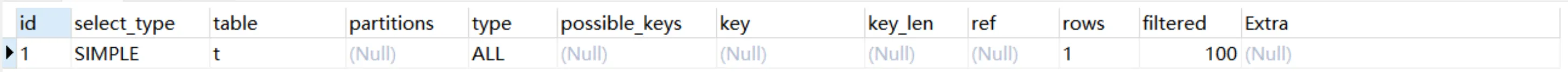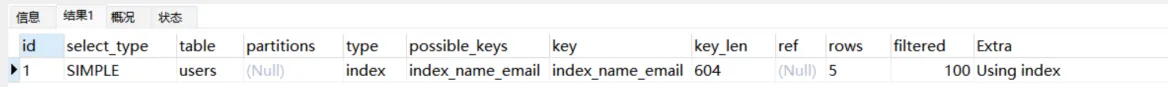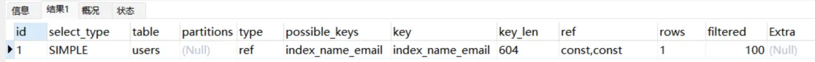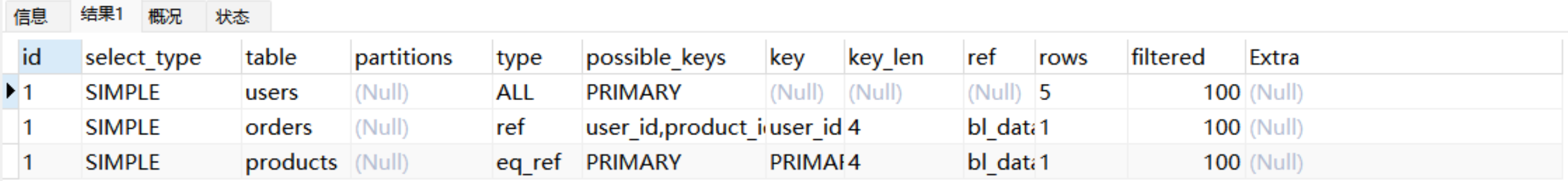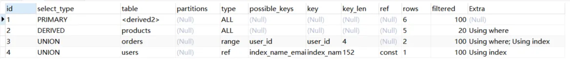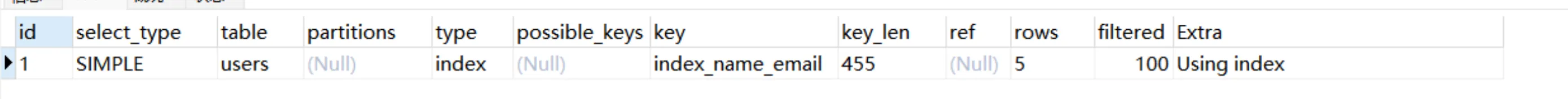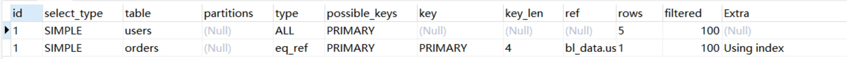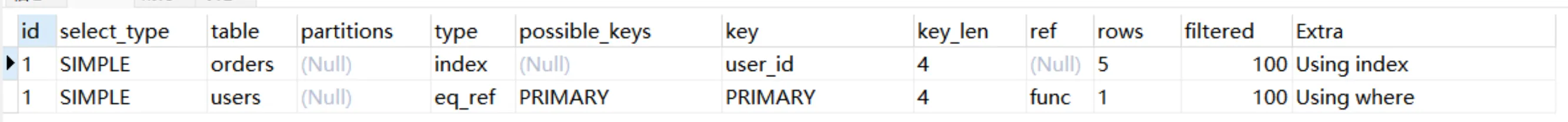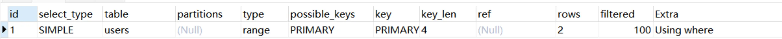 Explain Partitions select * from users;MySQL5.7版本引入了这两个特性,直接使用Explain关键字可以将partitions列、filtered列、extra列直接查询出来。