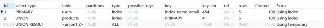 2.6.union:分union与union all两种,若第二个select出现在union之后,则被标记为union;如果union被from子句的子查询包含,那么第一个select会被标记为derived;union会针对相同的结果集进行去重,union all不会进行去重处理。